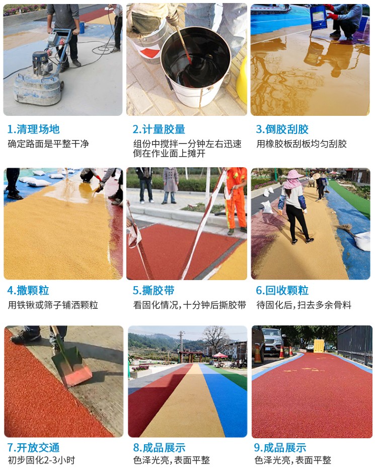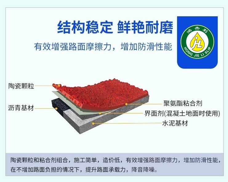 彩色防滑路面的優(yōu)點:防滑性能高,路面散水性好,色彩鮮艷;施工快速容易,鋪設(shè)效率高。特別配制的粘合劑固化快:速固化保證了持續(xù)施工,重新開放公路所需的時間大大減少;減少工作場地面積:比其他解決方案可省一半費用;降低噪音:用骨料做成的精細結(jié)構(gòu)有傳導音頻的效果,在水泥路面上使用可以將噪音降低;減少剎車距離:優(yōu)良的防滑性能減少40%的剎車陸離,此外重型卡車在轉(zhuǎn)彎處剎車不會產(chǎn)生抱死現(xiàn)象;最小的厚度:設(shè)計厚度為3-5mm,無須調(diào)整街道設(shè)施,也不影響排水;色彩鮮艷、可根據(jù)客戶要求提供顏色;用于交通減速帶時有很好的視覺和聽覺效果。